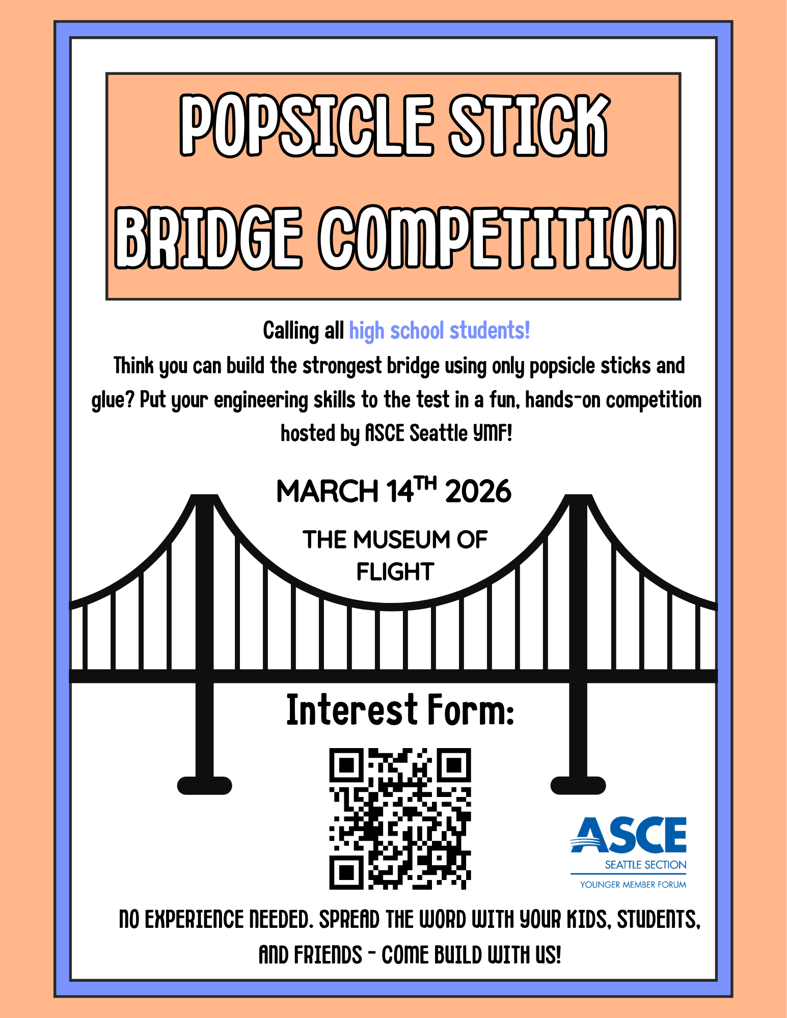 We are currently looking for high school students to participate in our Popsicle Stick Bridge Competition! This hands-on engineering challenges gives students the opportunity to design, built and test a bridge using only popsicle sticks and glue. On contest day, bridges will be loaded to see if any are left standing!